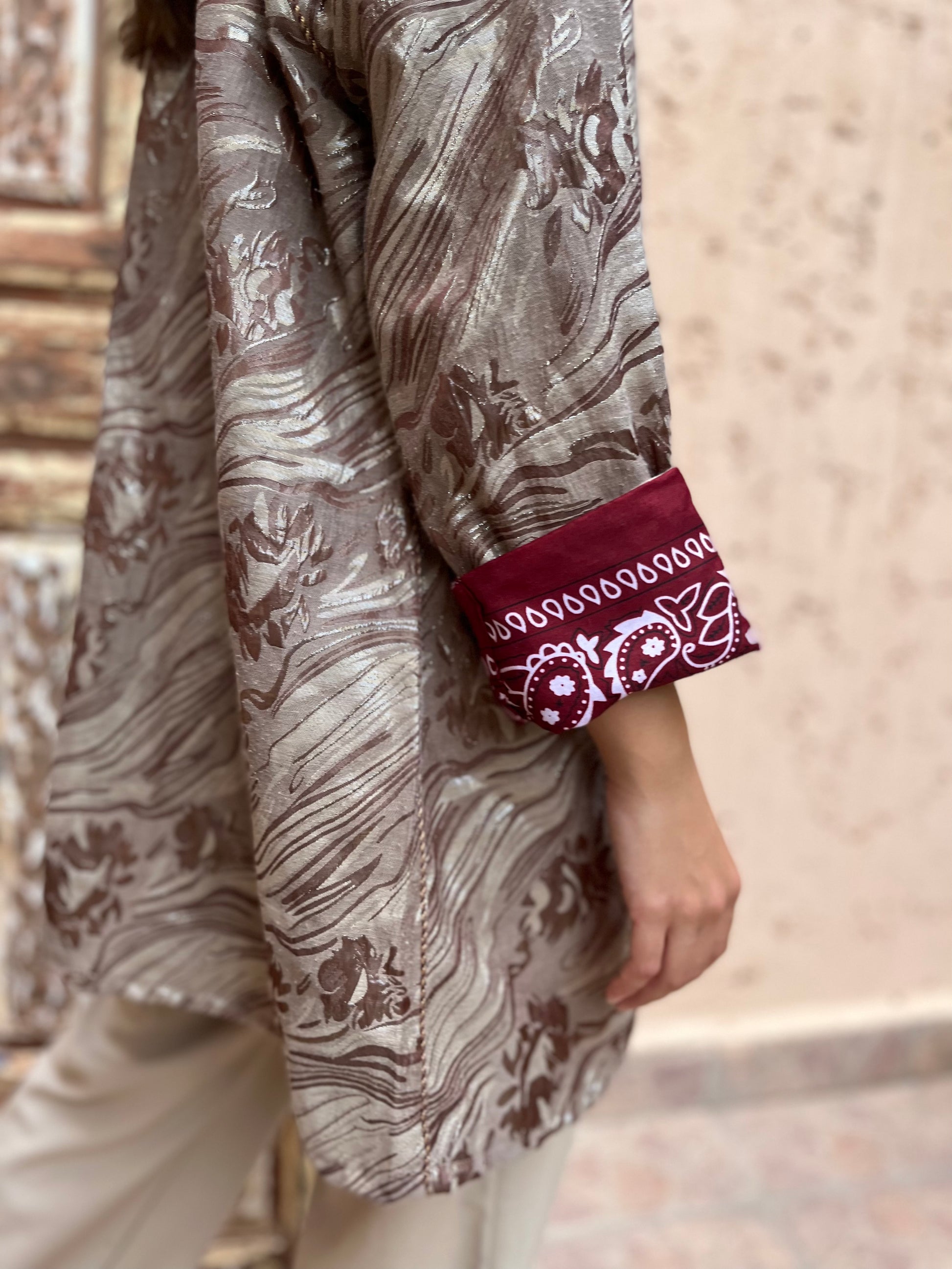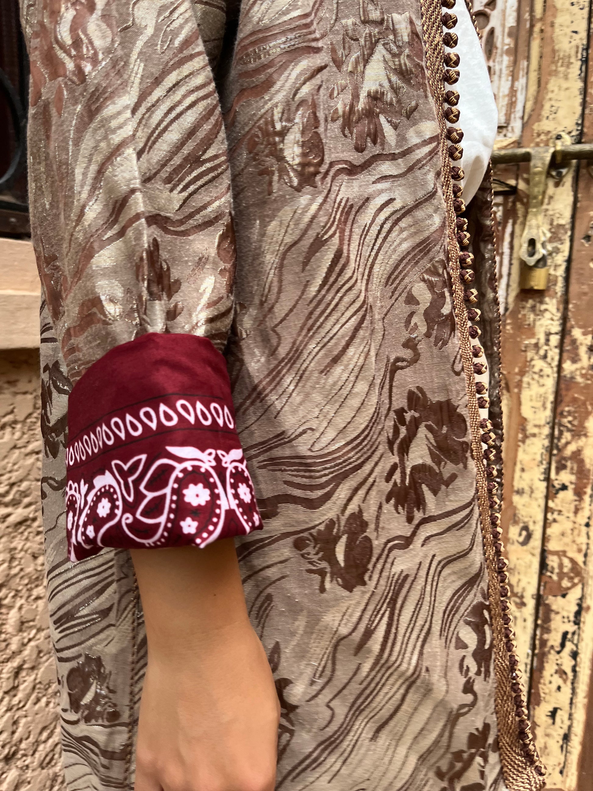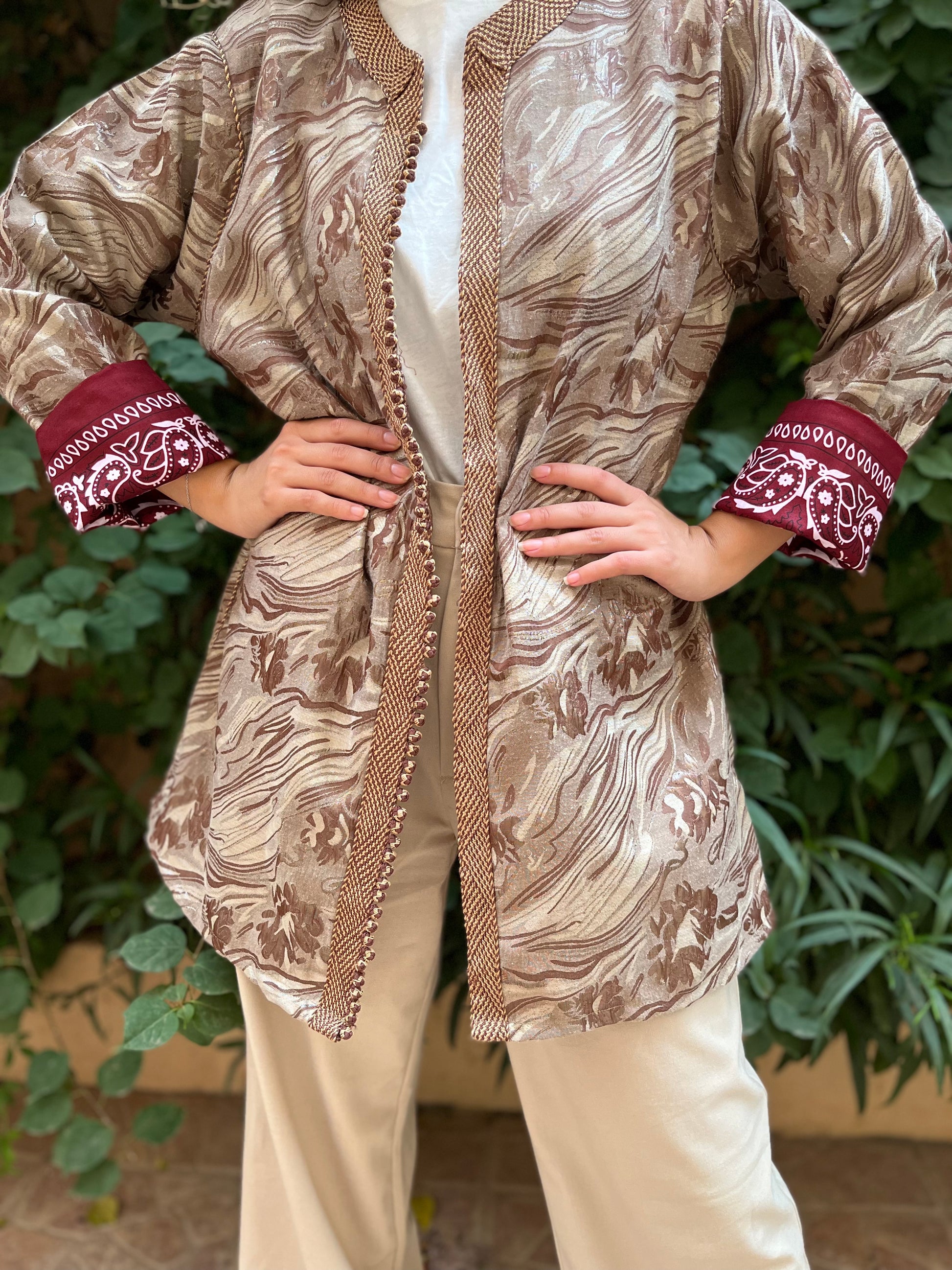 Elevate your wardrobe with the Zaynab Bronze Elegance, a luxurious Moroccan kaftan featuring a soft, flowy texture and a marbled floral pattern in bronze and taupe tones. The structured shoulders and detailed front trim add sophistication, while the bold burgundy cuffs with white bandana-style motifs bring a modern twist. Perfect for day or night, this piece blends tradition and contemporary fashion beautifully.